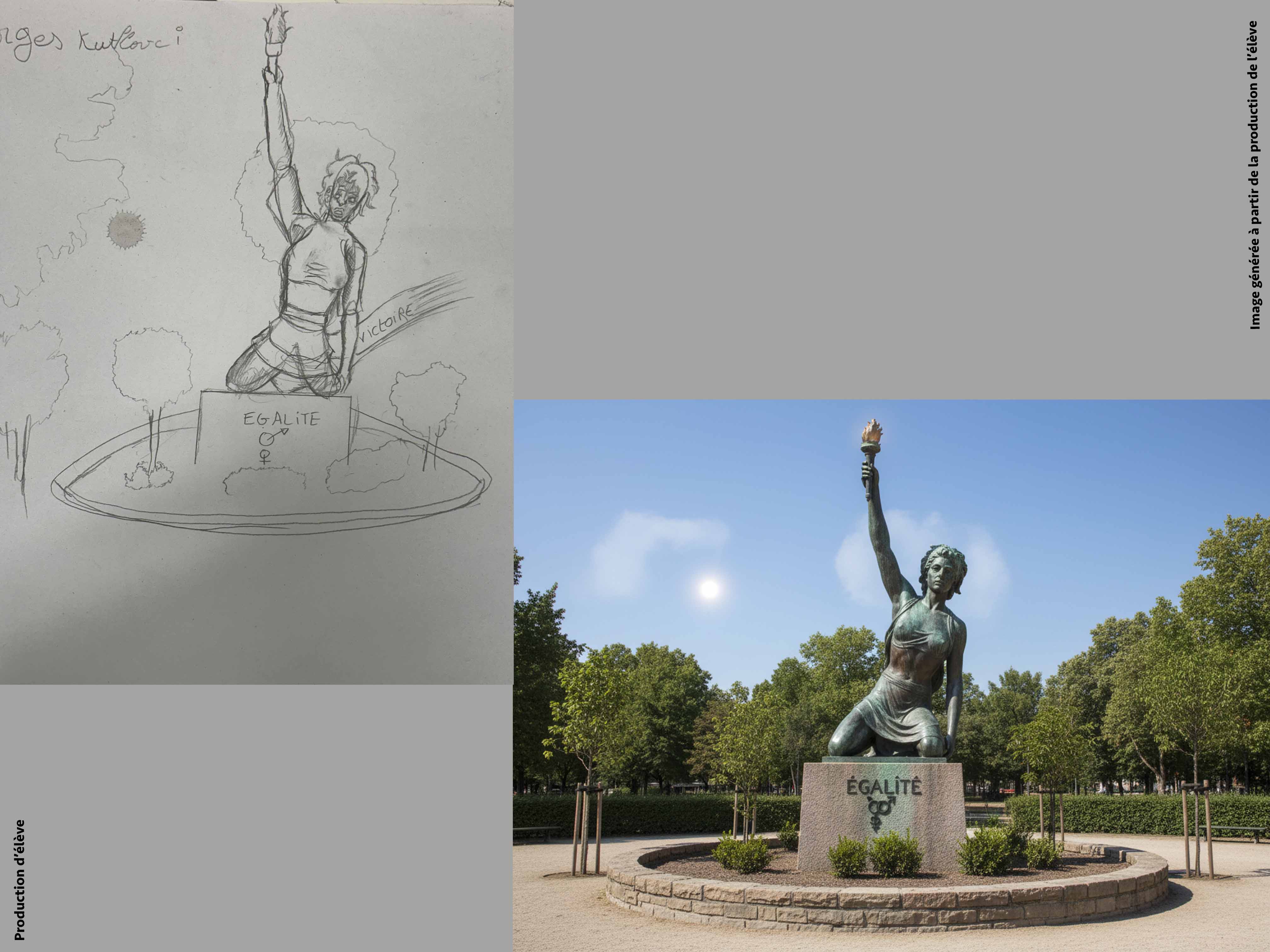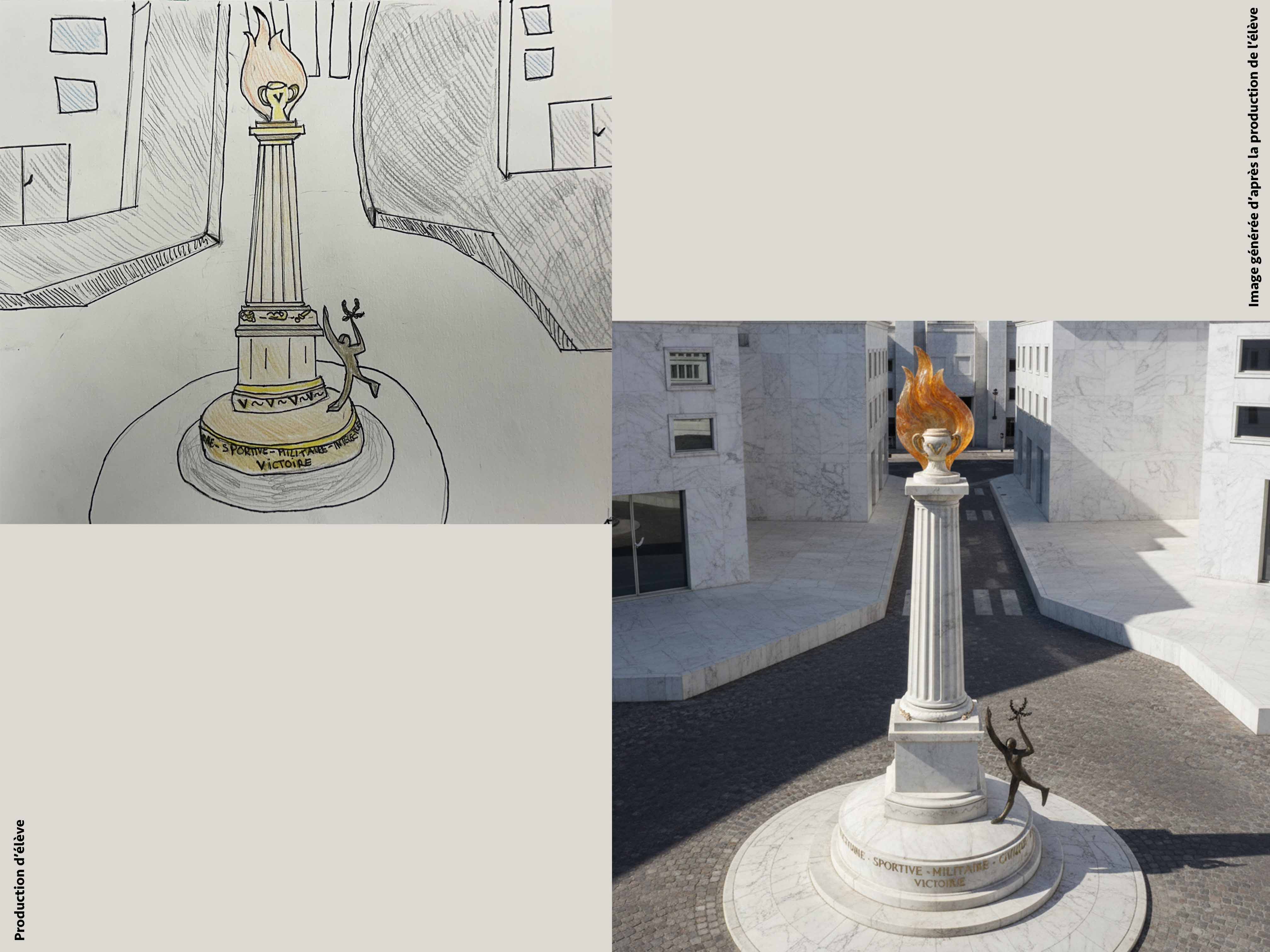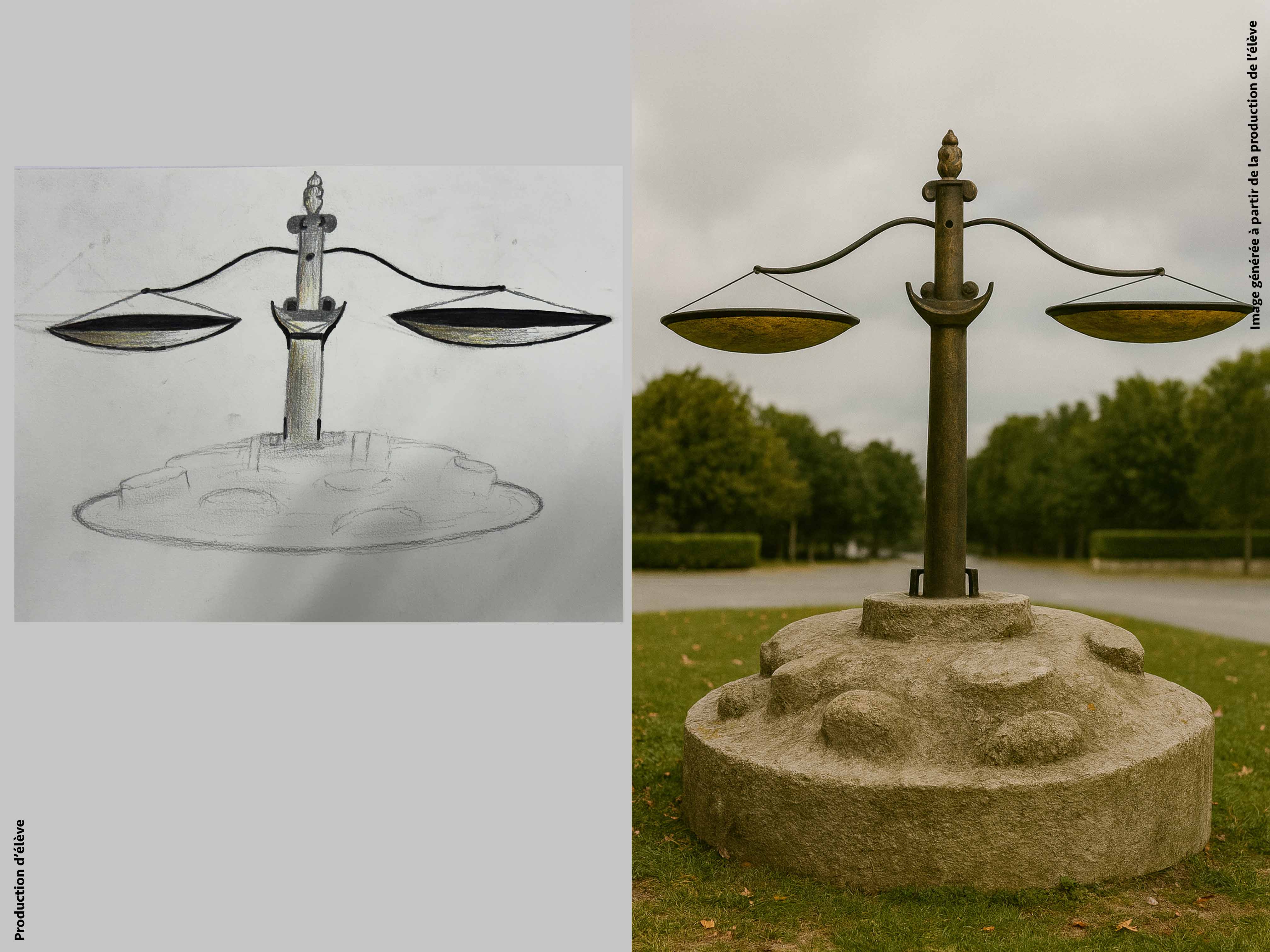 Lors de la verbalisation devant les productions générées par l’IA (Firefly), les élèves se sont montrés très surpris des résultats. Certains ont trouvé leur dessin enrichi d’une nouvelle dimension : celle d’avoir pu transposer un projet de monument dans une visée qui permettait de se faire une idée plus juste de l’échelle de leur sculpture et des matériaux employés. Mais l’IA permet aussi de découvrir certains biais et défaillances et de donner une valeur esthétique à ce qui apparaissaient à quelques maladresses dans le dessin des élèves.
