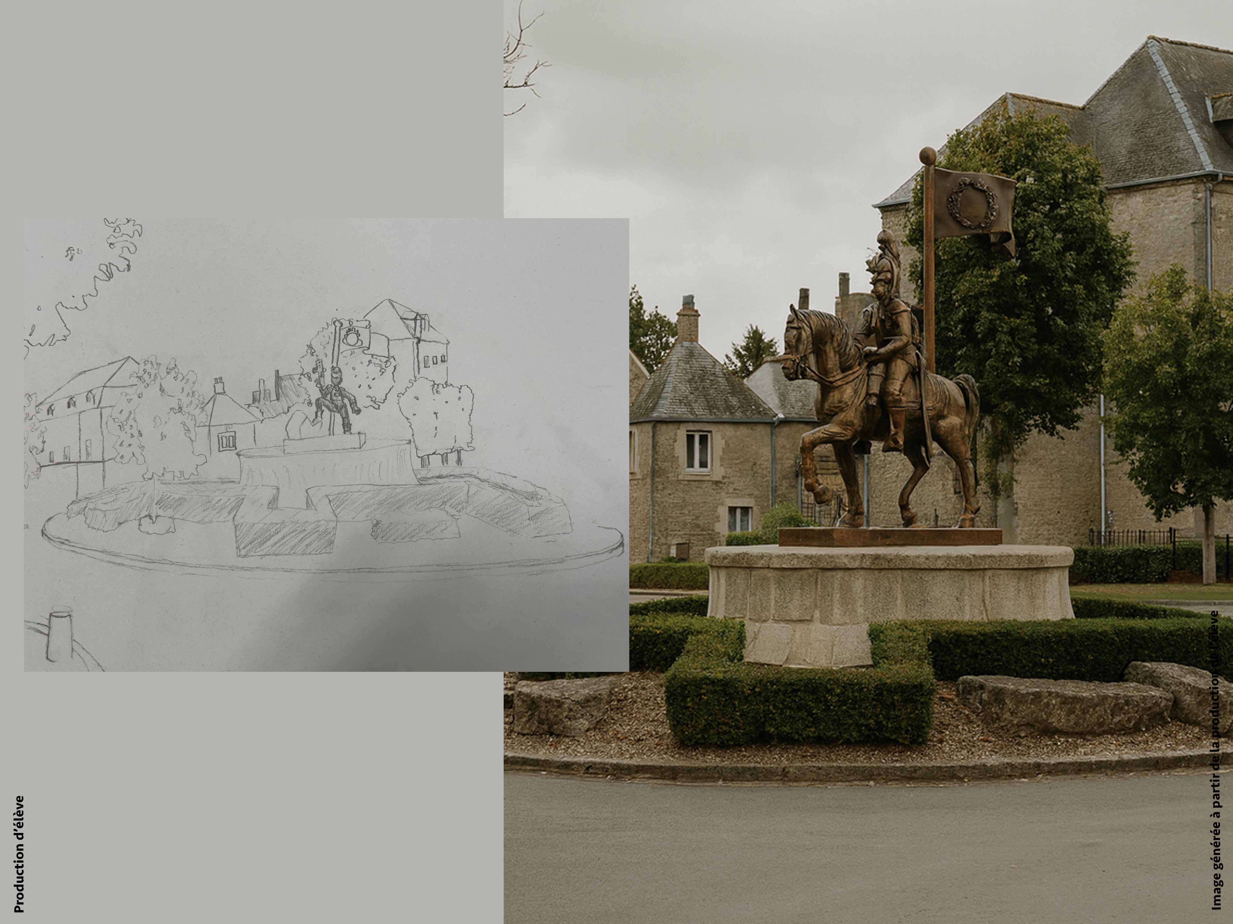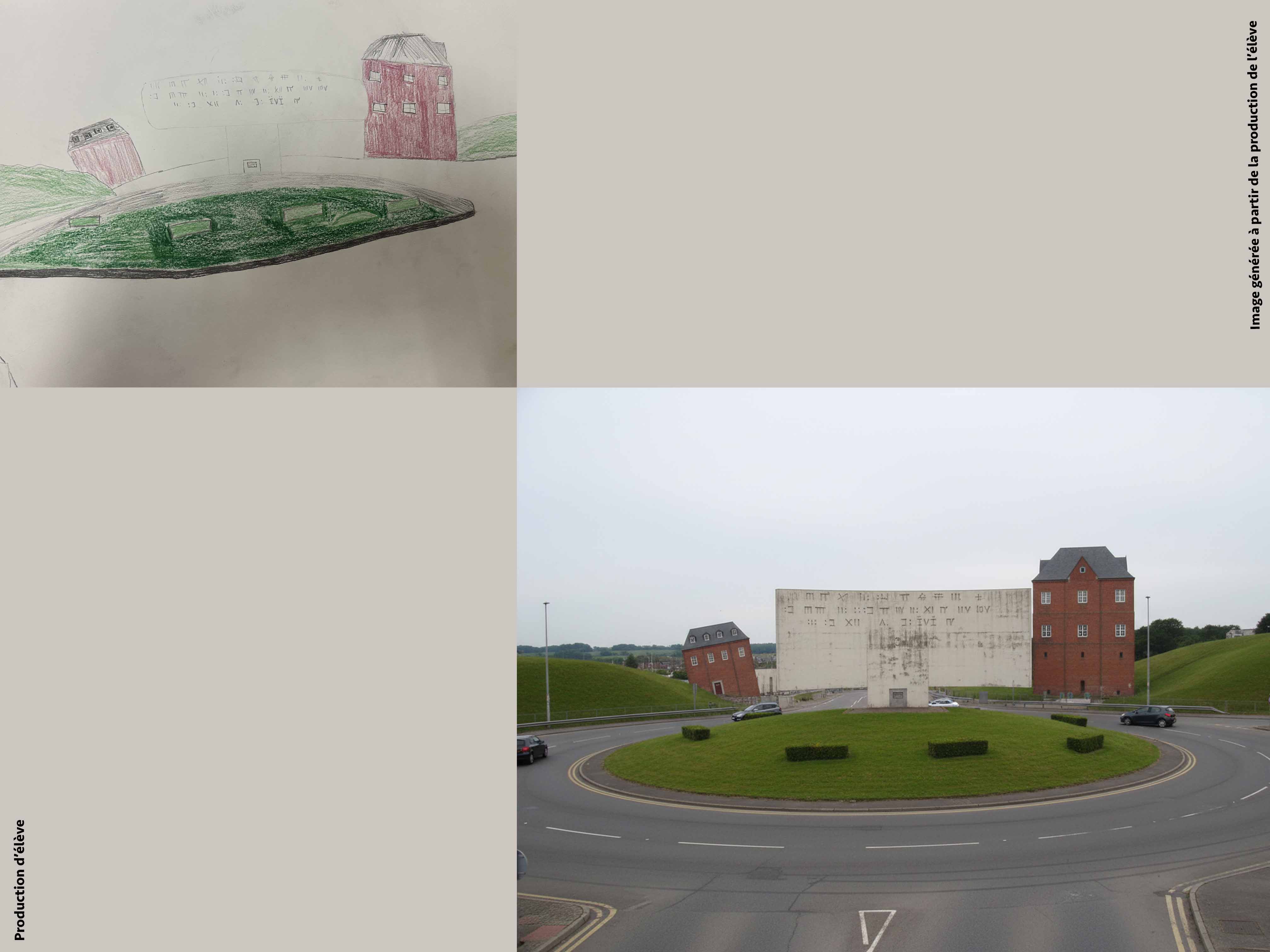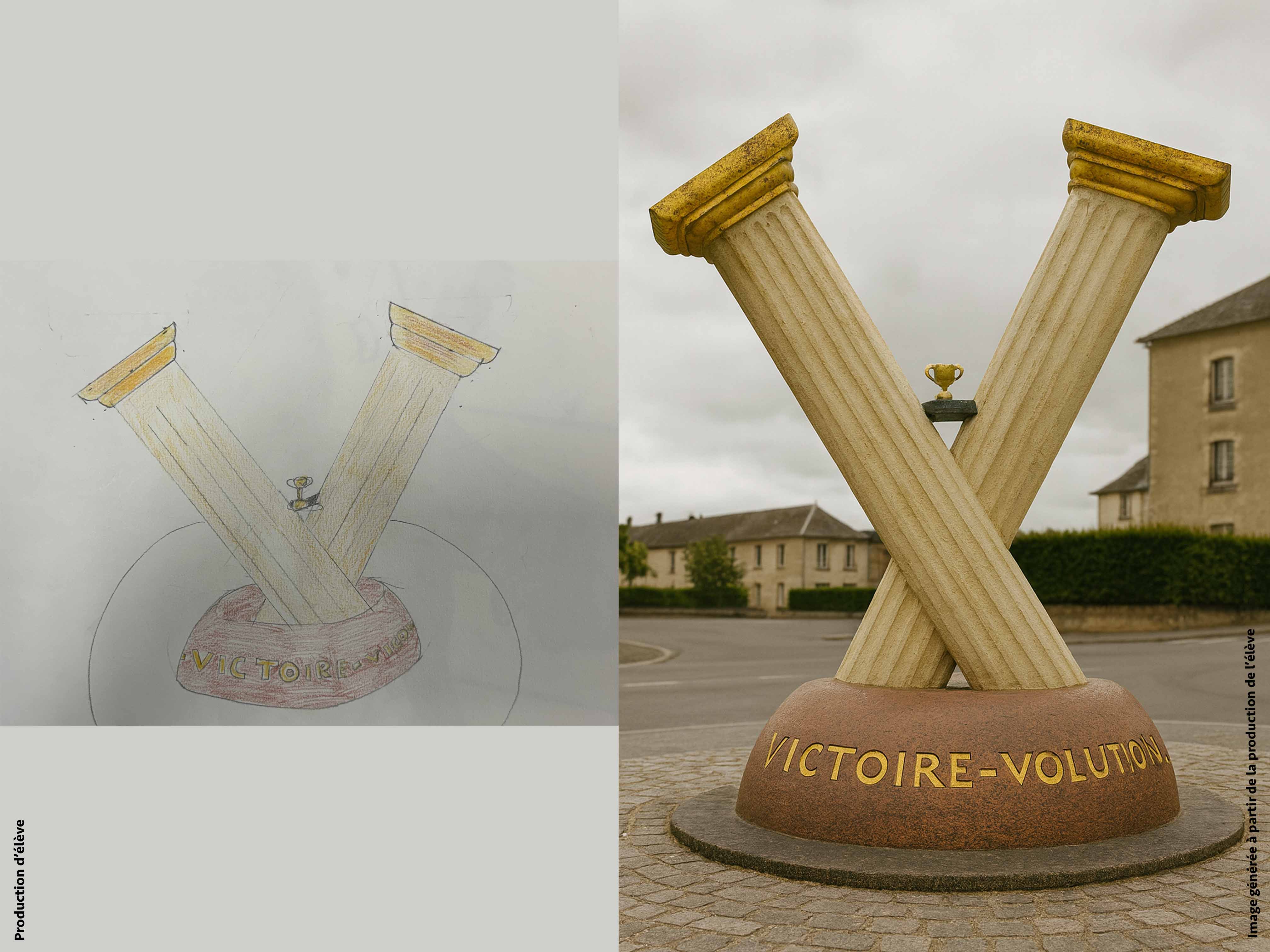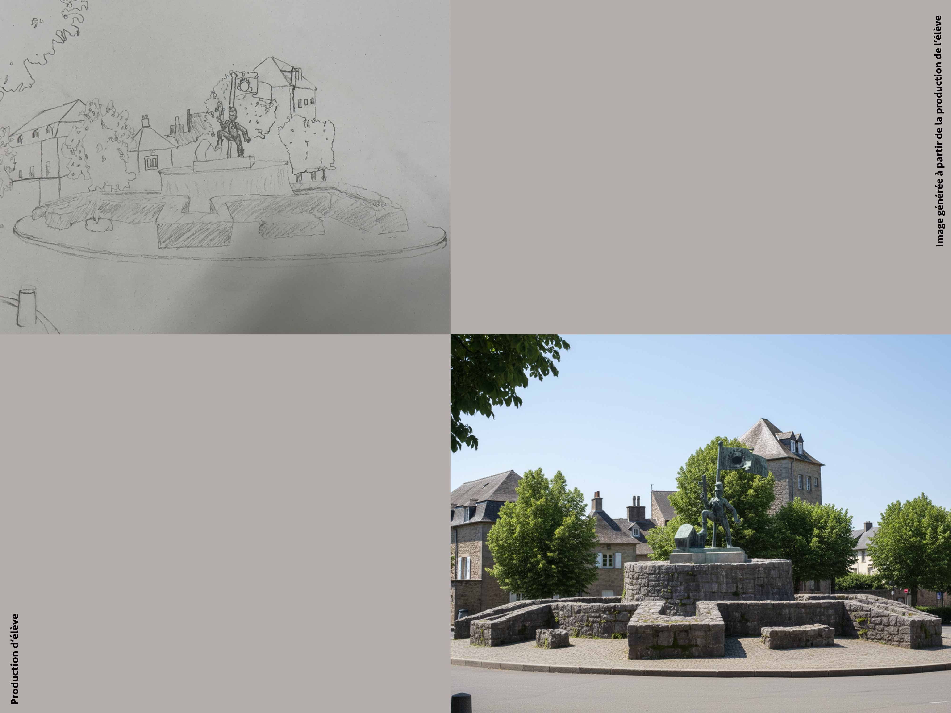 Lors de la verbalisation devant les productions générées par l’IA (Firefly), les élèves se sont montrés très surpris des résultats. Certains ont trouvé leur dessin enrichi d’une nouvelle dimension : celle d’avoir pu transposer un projet de monument dans une visée qui permettait de se faire une idée plus juste de l’échelle de leur sculpture et des matériaux employés. Mais l’IA permet aussi de découvrir certains biais et défaillances et de donner une valeur esthétique à ce qui apparaissaient à quelques maladresses dans le dessin des élèves.
