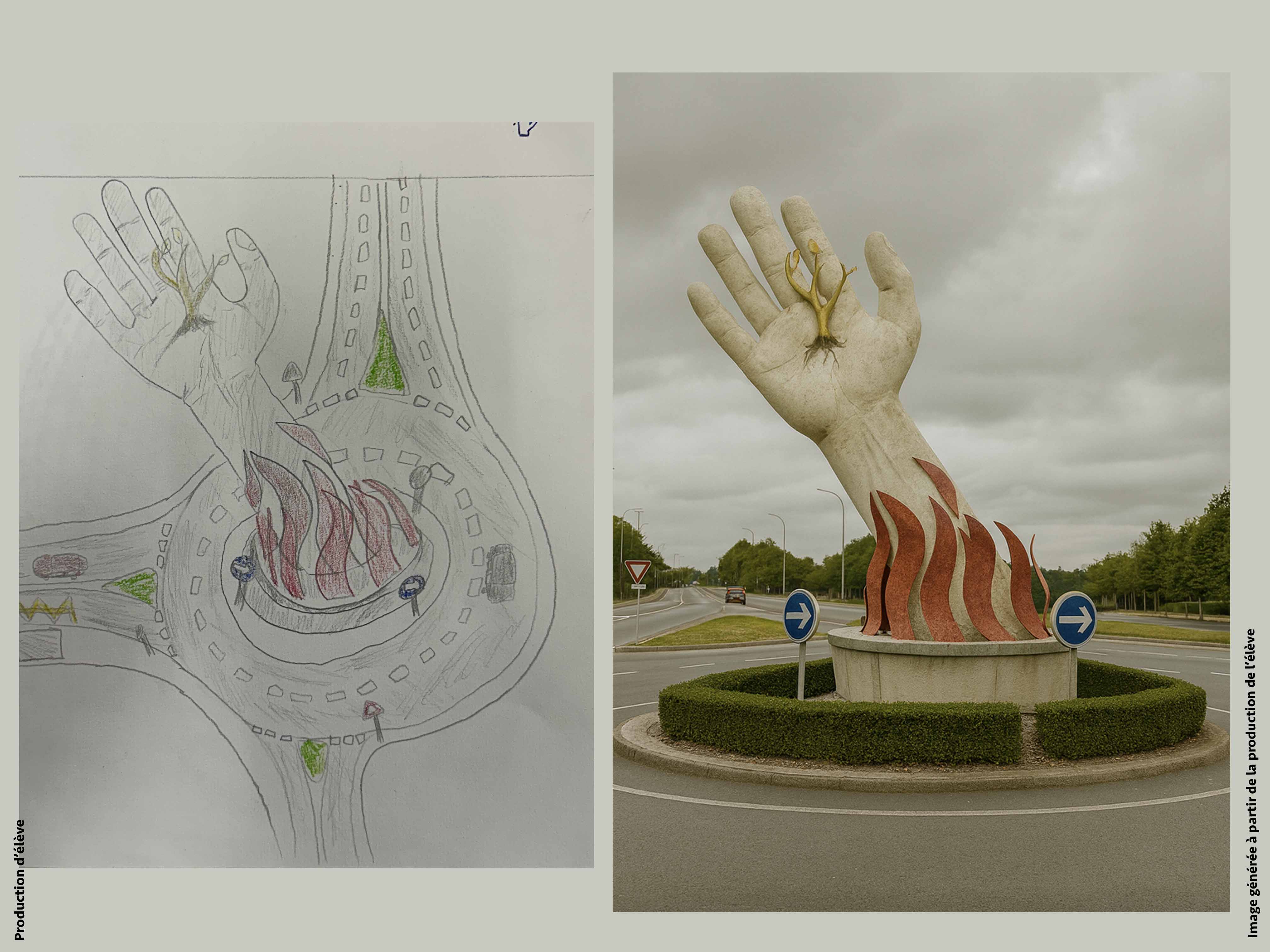 Chaque production d’élève a fait l’objet d’une transposition photographique via une IA générative dans un « style réaliste ». Pour sensibiliser les élèves à la dépense énergétique que représente l’usage de l’IA, une seule proposition par production a été retenue pour cette expérimentation.