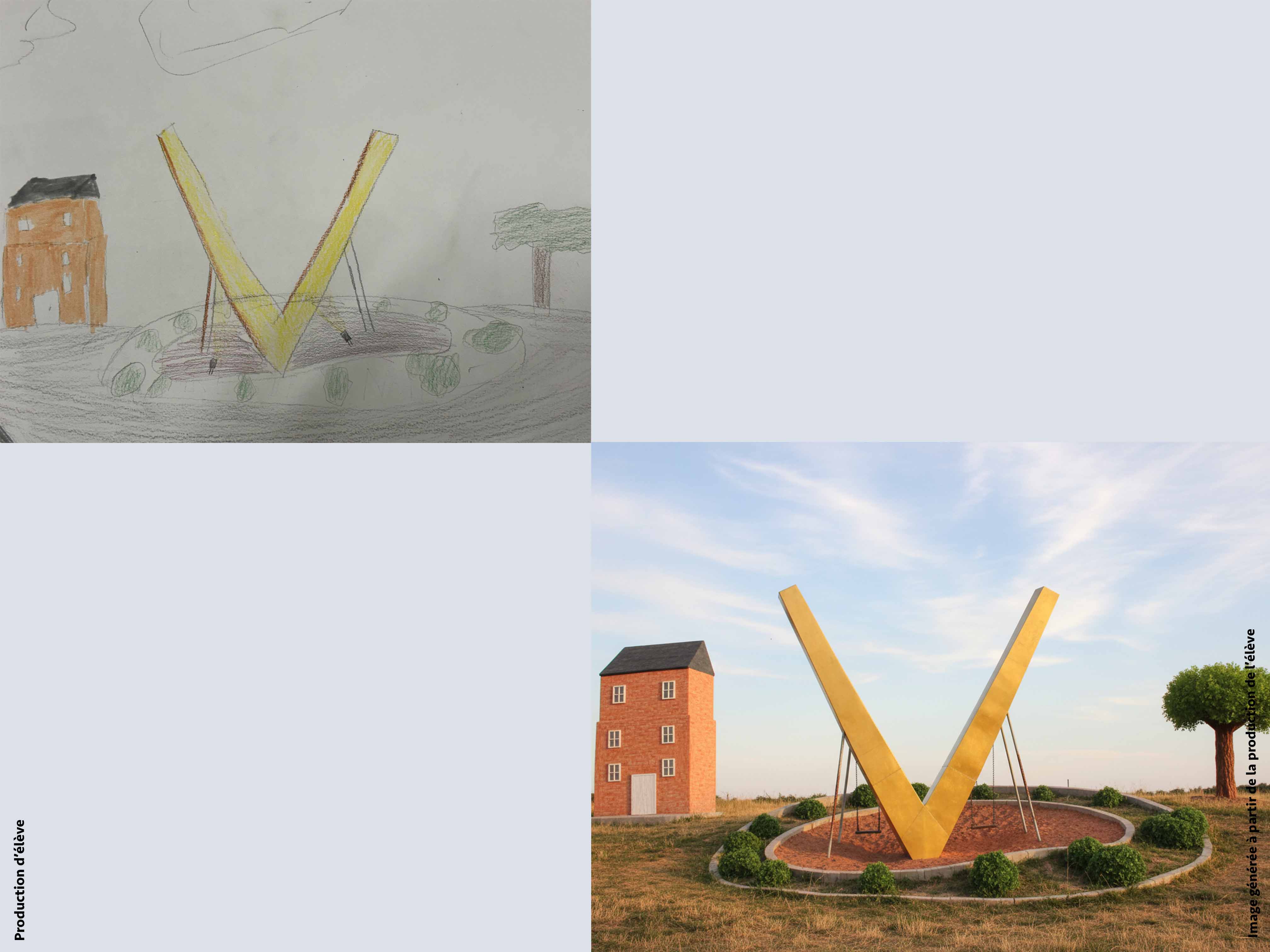 Les élèves ont eu à imaginer en arts plastiques, un projet de monument pour célébrer le mot « Victoire » à l’échelle de la place Royale à Saint-Germain (une place sans monument).
