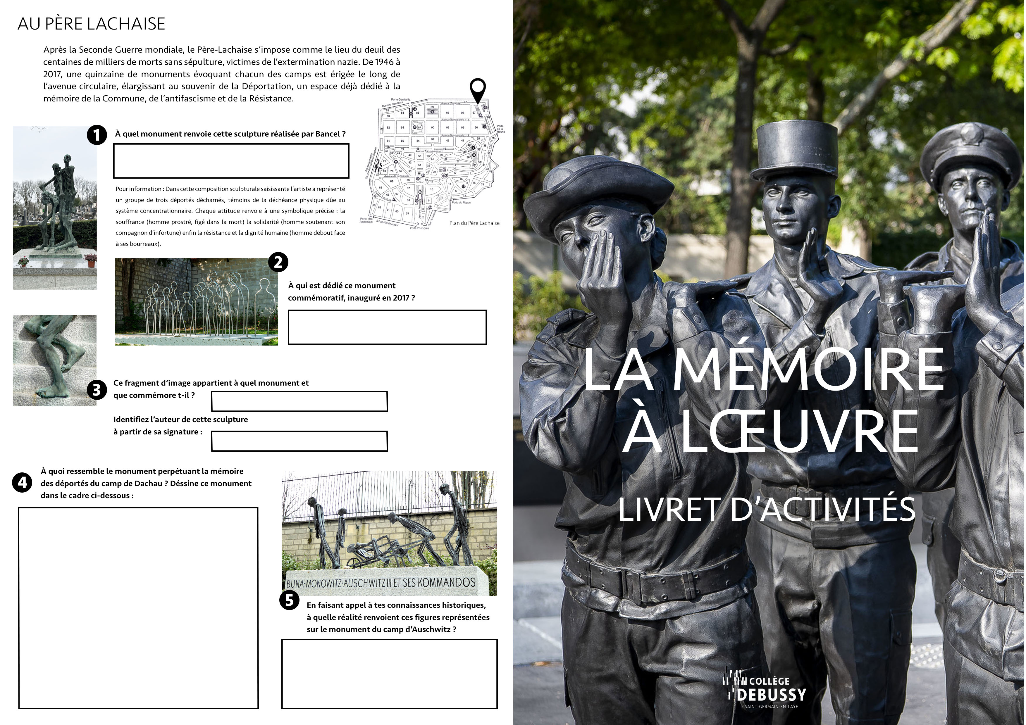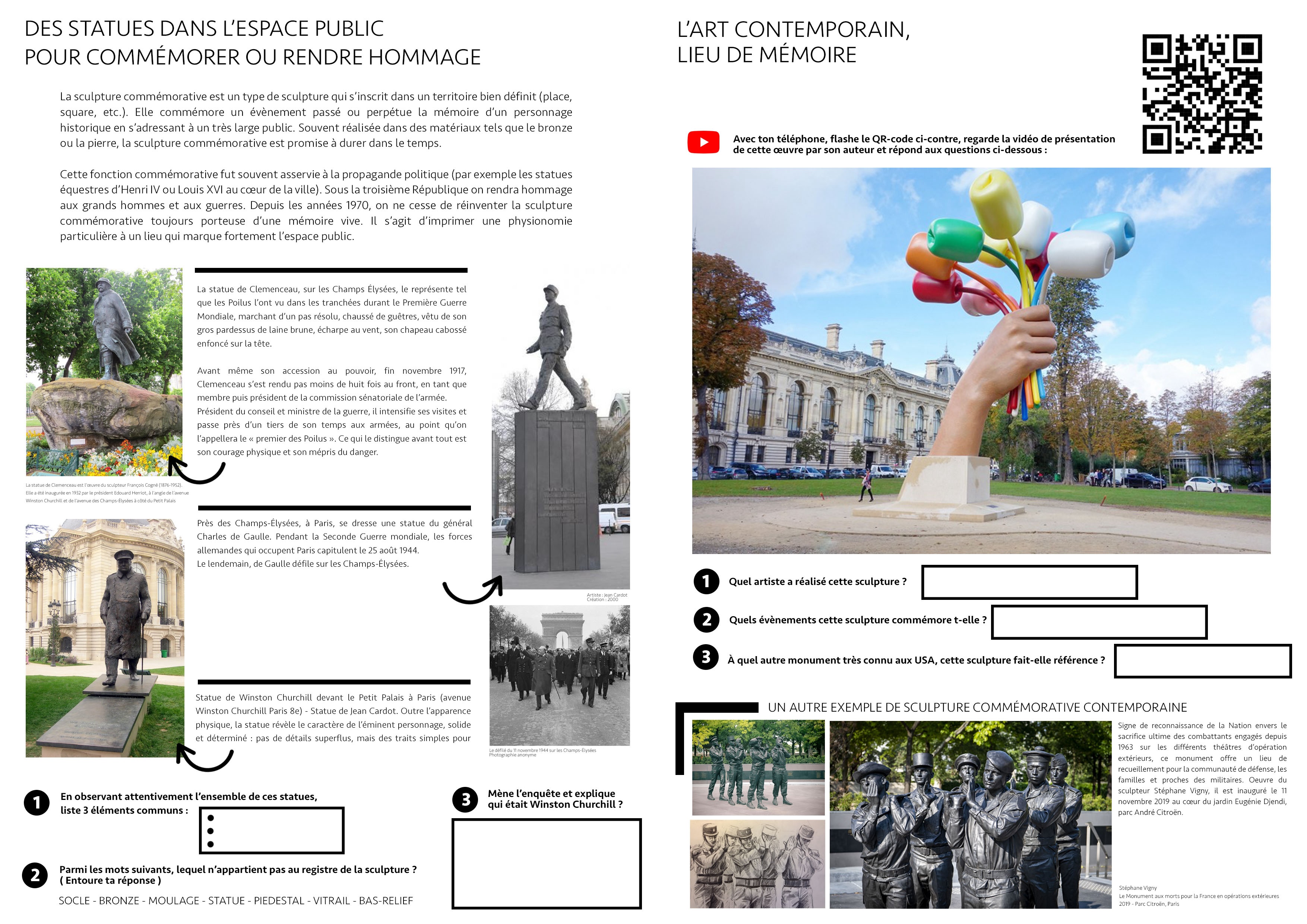 Un livret d’activités "La mémoire à l’œuvre" accompagne également cette ressource. Il a été réalisé dans le cadre d’un projet de sortie pédagogique dans Paris, pour une découverte de quelques monuments et statues dans l’espace public.