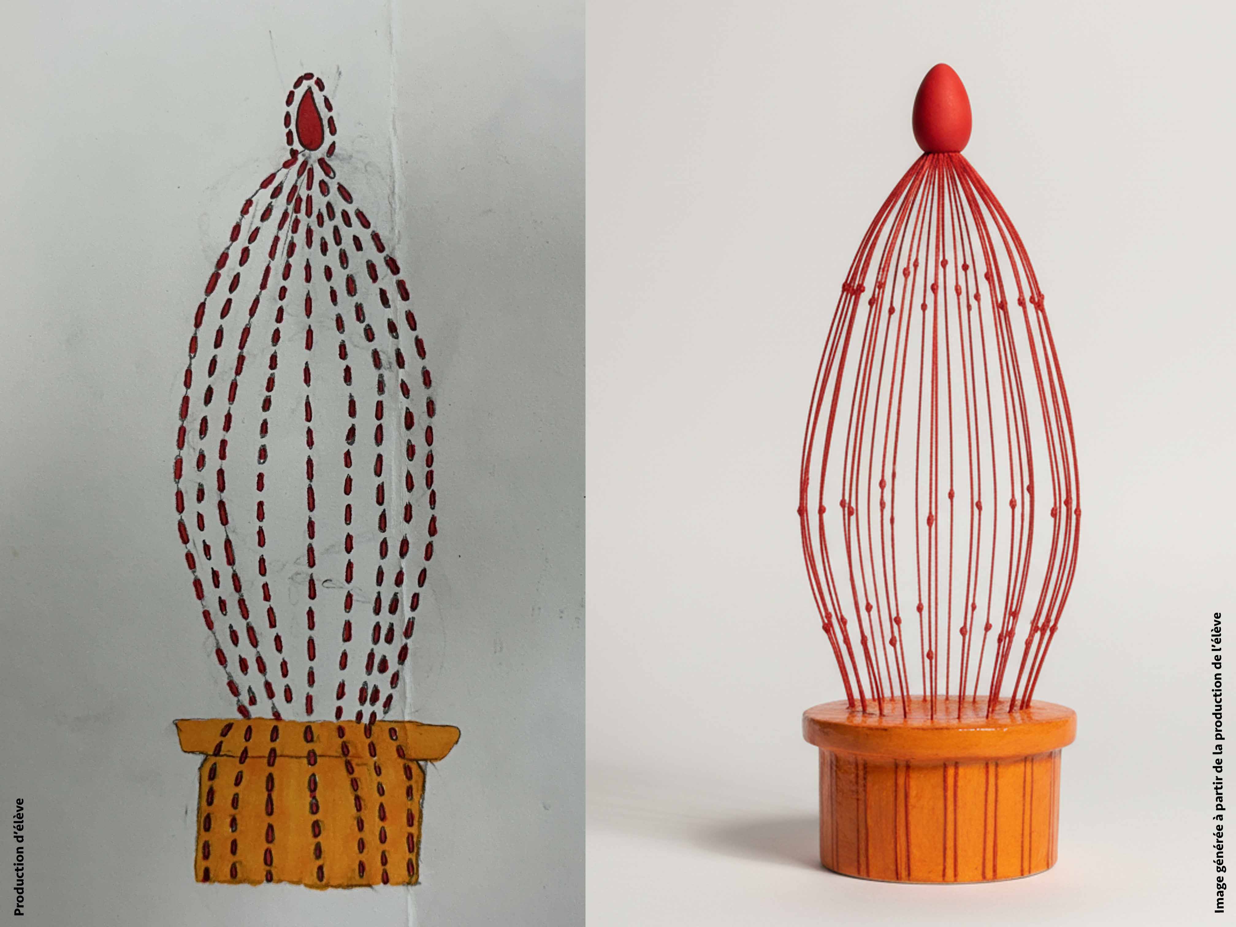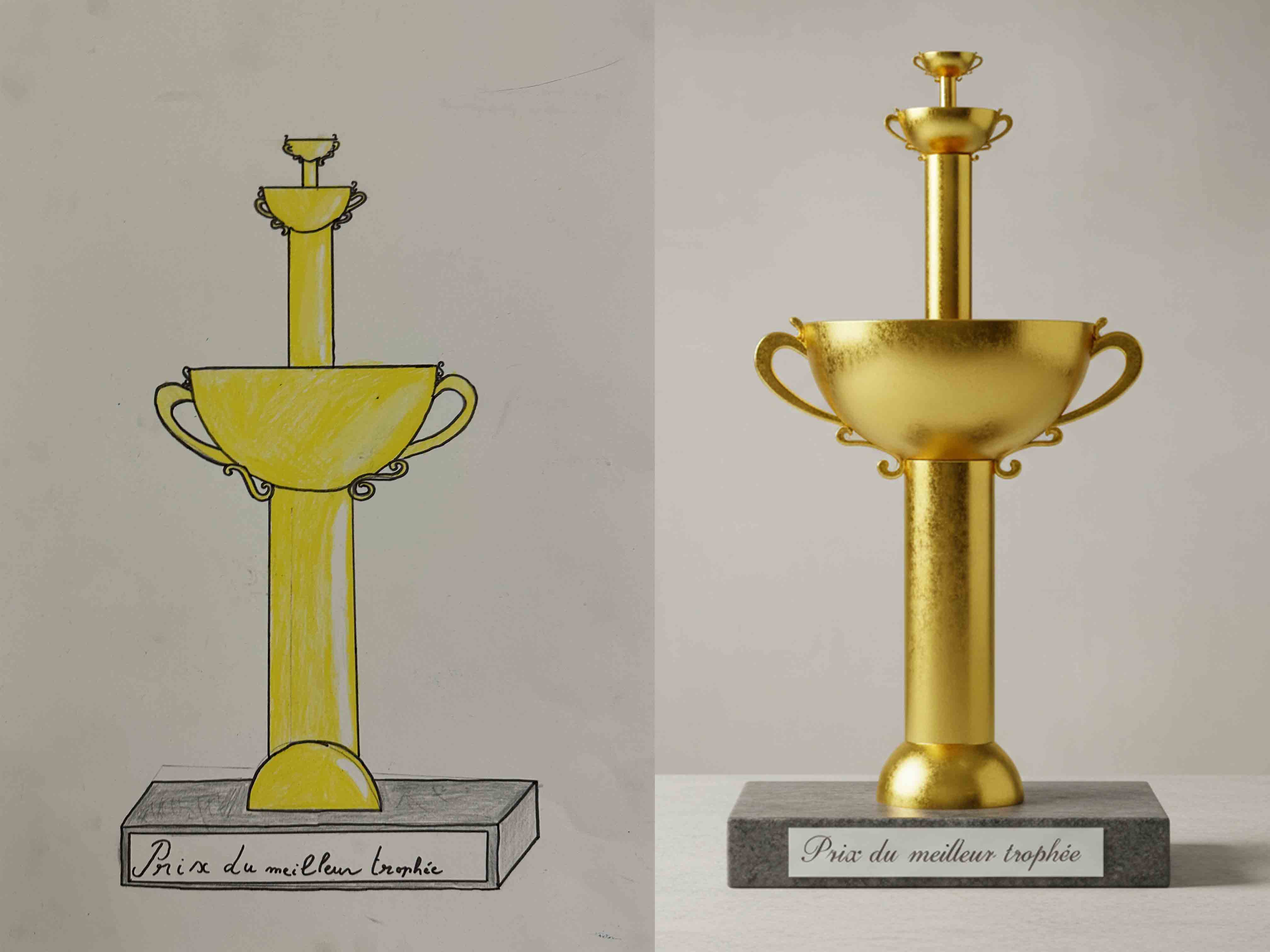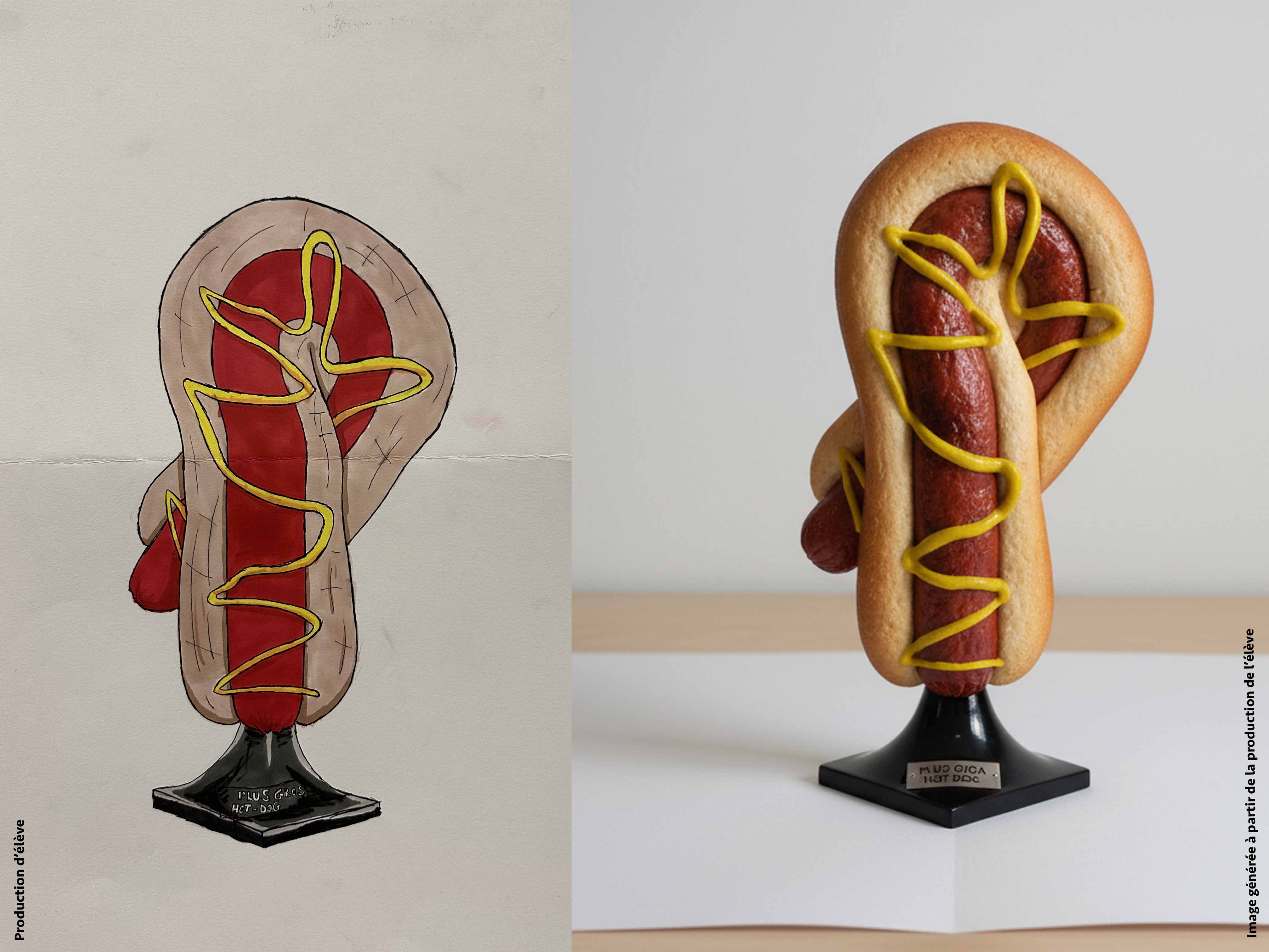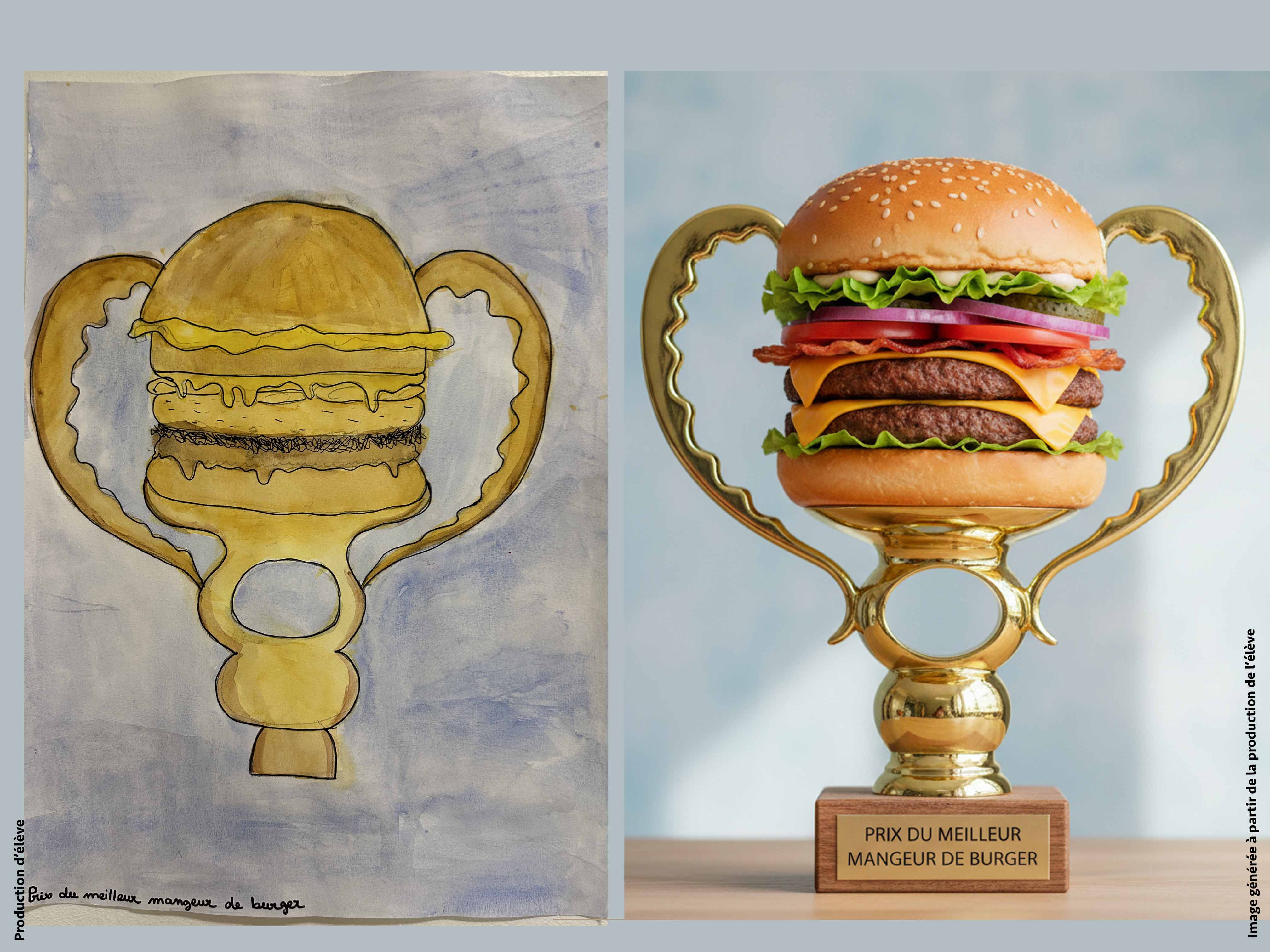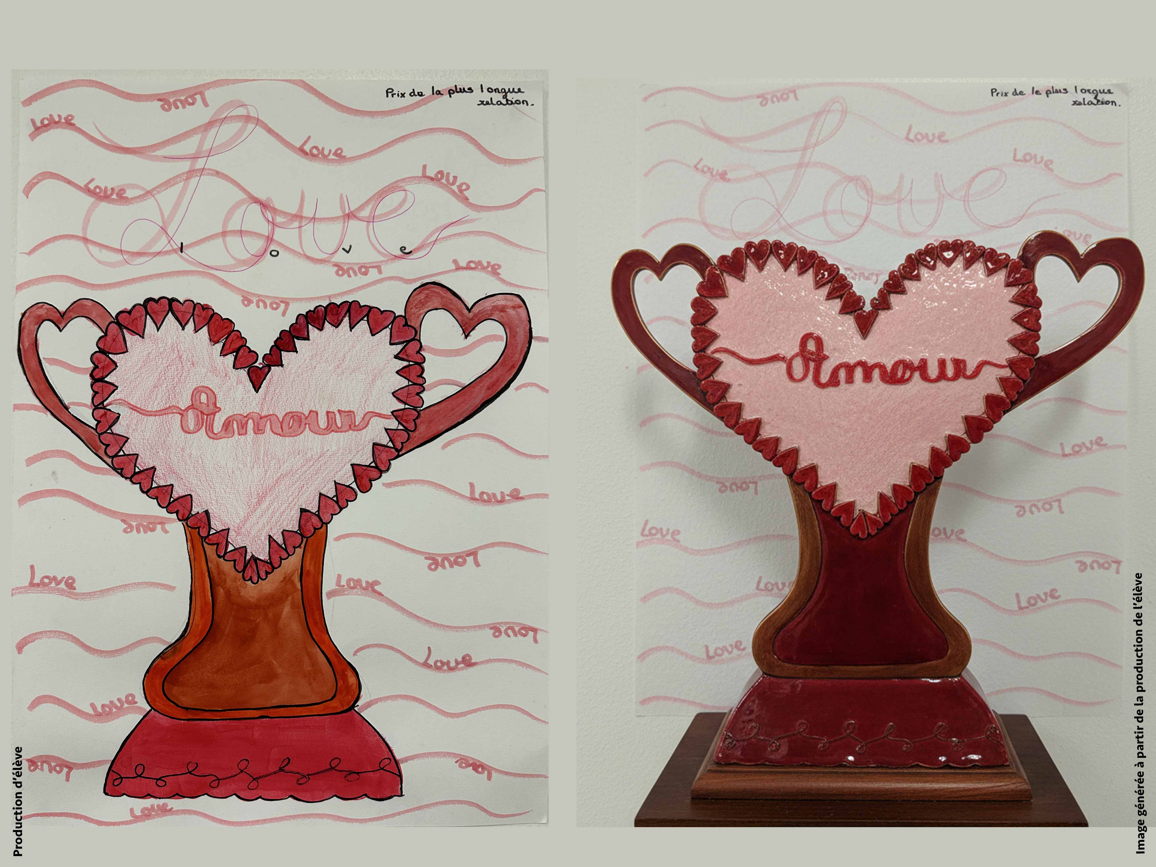 Lors de la verbalisation devant les images générées par l’IA (Firefly), les élèves ont eu la surprise de redécouvrir leur travail dans une image photo-réaliste. Les effets de matière, de texture, la réinvention de certaines couleurs ont permis d’offrir un éclat supplémentaire à leur trophée en ouvrant le débat sur le caractère créatif d’un travail en amont d’un traitement esthétique avec usage de l’IA.