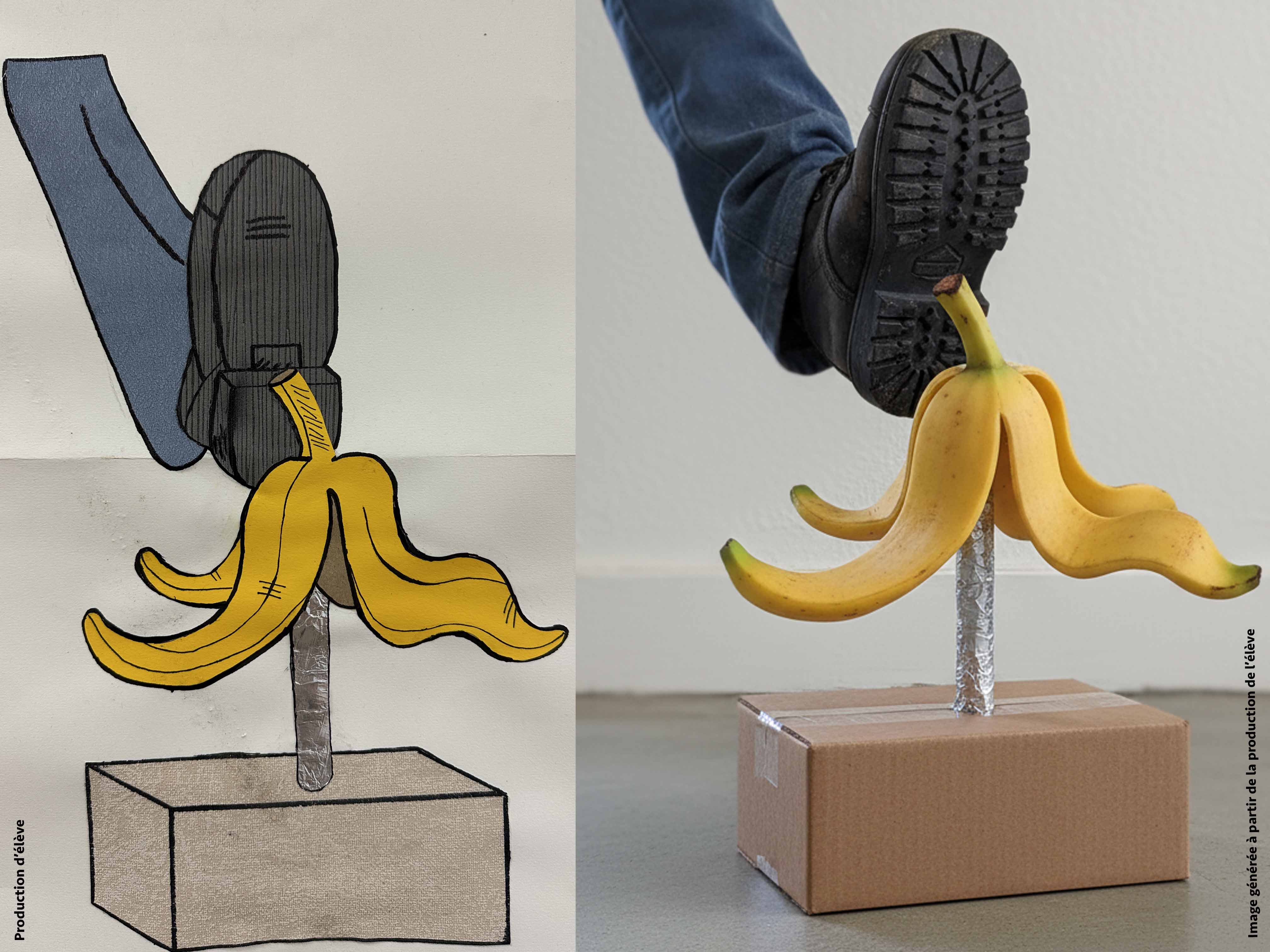 Chaque production d’élève a fait l’objet d’une transposition photographique avec le compte personnel de l’enseignant via une IA générative (Firefly), dans un « style réaliste ».