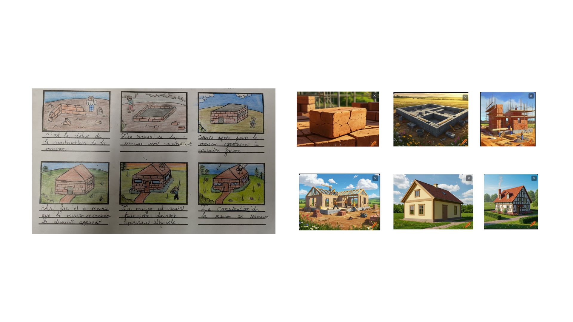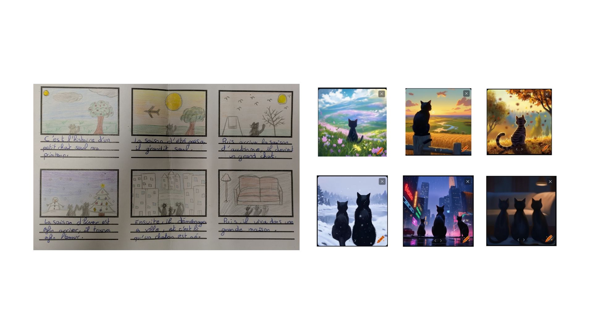 Vous trouverez à la suite de cet article deux vidéos générées par IA (Kling 1.6) à partir du storyboard et des prompts de deux élèves d’ULIS en classe d’inclusion, et en portfolio la comparaison entre le storyboard et la génération par IA (Lexica.art et/ou Craiyon).
