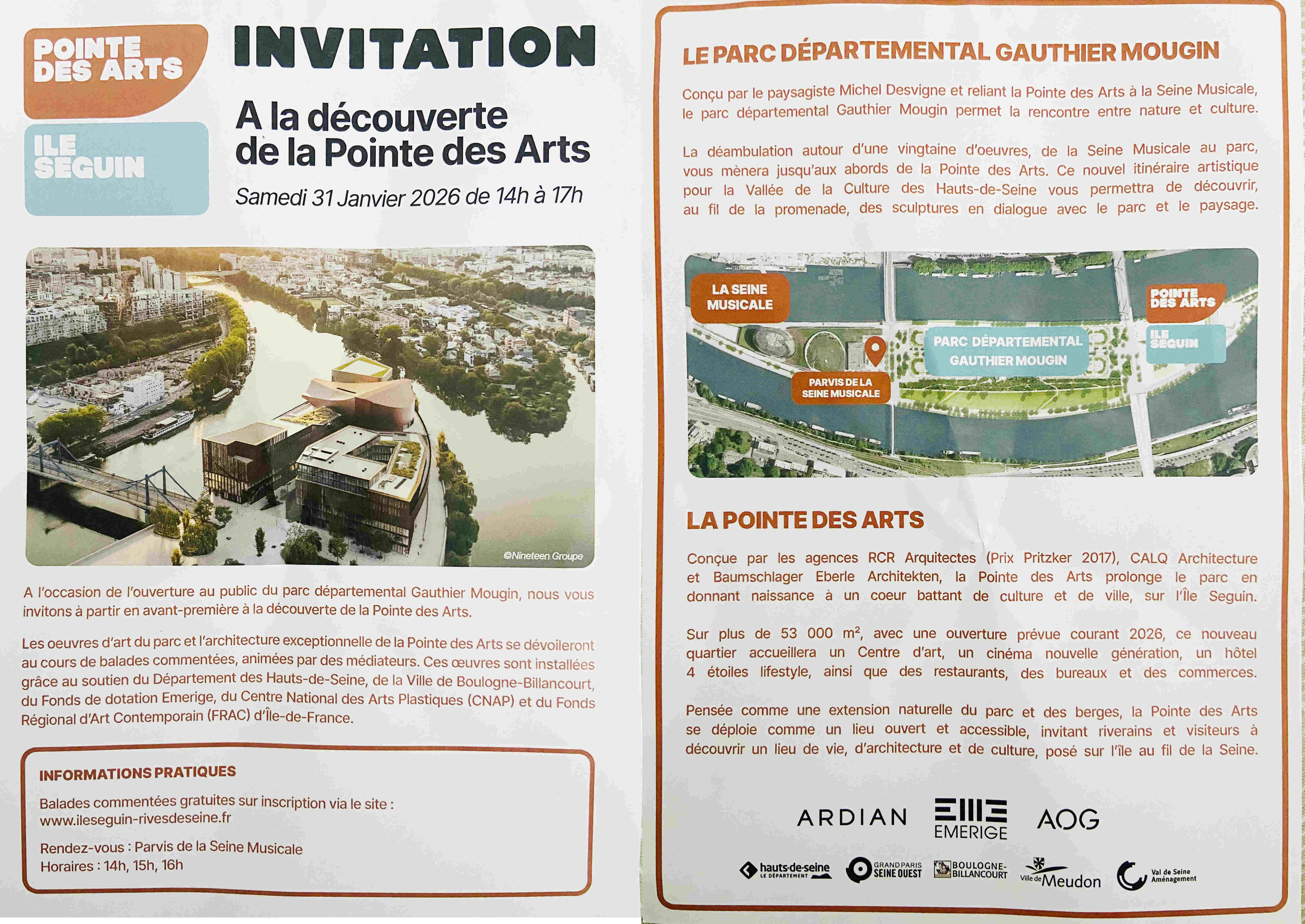 À l’occasion de l’ouverture au public du parc départemental de sculptures Gauthier Mougin, des visites sont prévues en avant-première à la découverte d’un paysage inédit, lors de balades guidées animées par des médiateurs le samedi 31 janvier de 14h à 17h. La visite débutera par la présentation de l’ambitieux projet de renaturation conçu par le paysagiste Michel Desvigne. Des œuvres d’art contemporain jalonnent le parcours et composent un véritable musée à ciel ouvert. Ces œuvres sont installées grâce au soutien du Département des Hauts-de-Seine, de la Ville de Boulogne-Billancourt, du Fonds de dotation Emerige, du Centre National des Arts Plastiques (CNAP) et du Fonds Régional d’Art Contemporain (FRAC) d’Île-de-France.